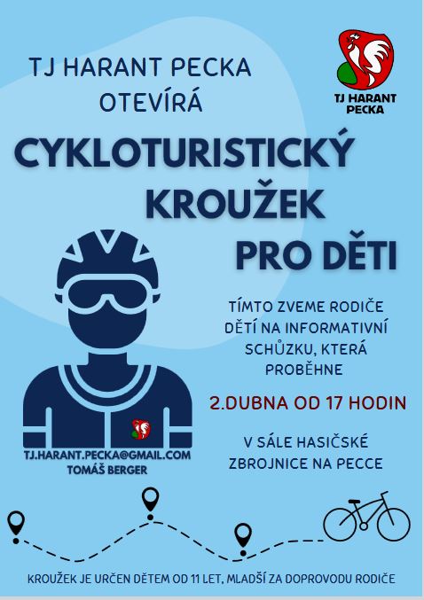 TJ Harant Pecka otevírá cykloturistický kroužek pro děti. Zveme rodiče na informativní schůzku, která proběhne dne 2. dubna od 17 hod. v sále hasičské zbrojnice v Pecce.