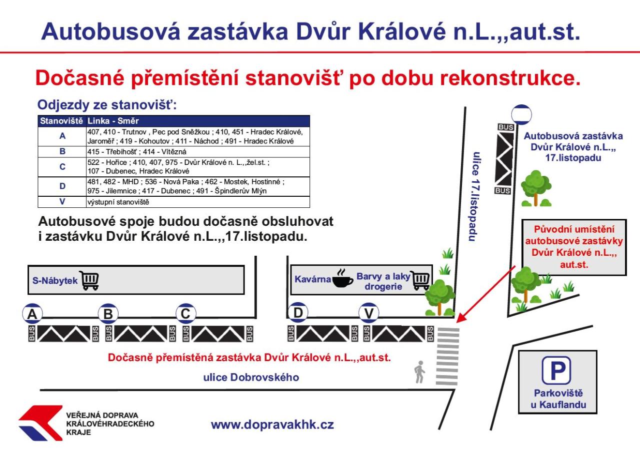 Zastávky Dvůr Králové n.L.,,aut.st. budou přesunuty do ulice Dobrovského. Z prostorových a dopravních důvodů bude po dobu rekonstrukce obsluhována rovněž zastávka Dvůr Králové n.L.,, 17. listopadu, na které zastaví všechny projíždějící spoje a tedy část přestupních vazeb bude realizována i zde (např. Bílá Třemešná – Trutnov).
