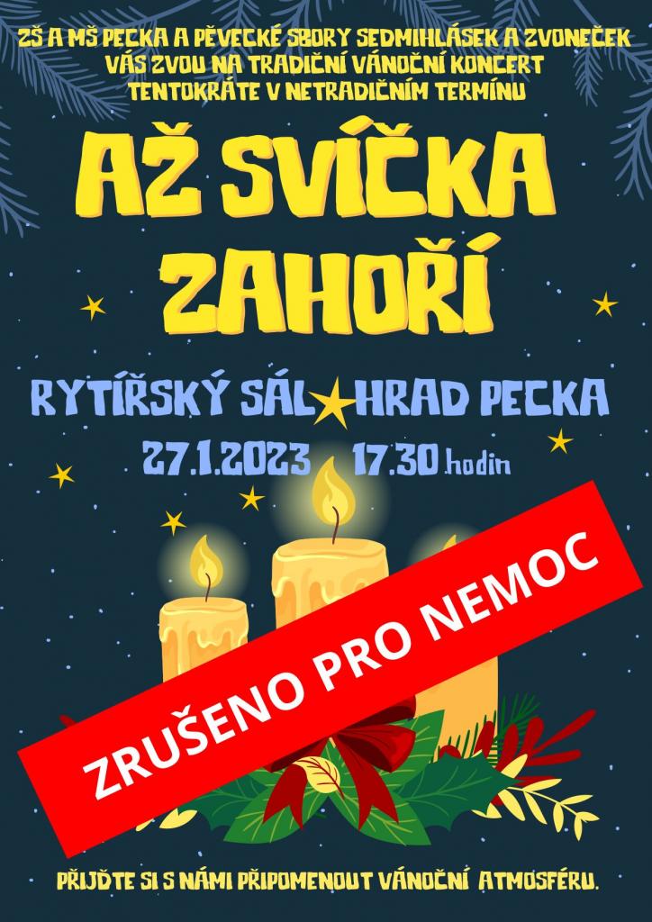 S politováním oznamujeme, že koncert Až svíčka zahoří, který se měl konat dne 27.1.2023 na hradě Pecka, je z důvodu nemoci ZRUŠEN. Děkujeme za pochopení.