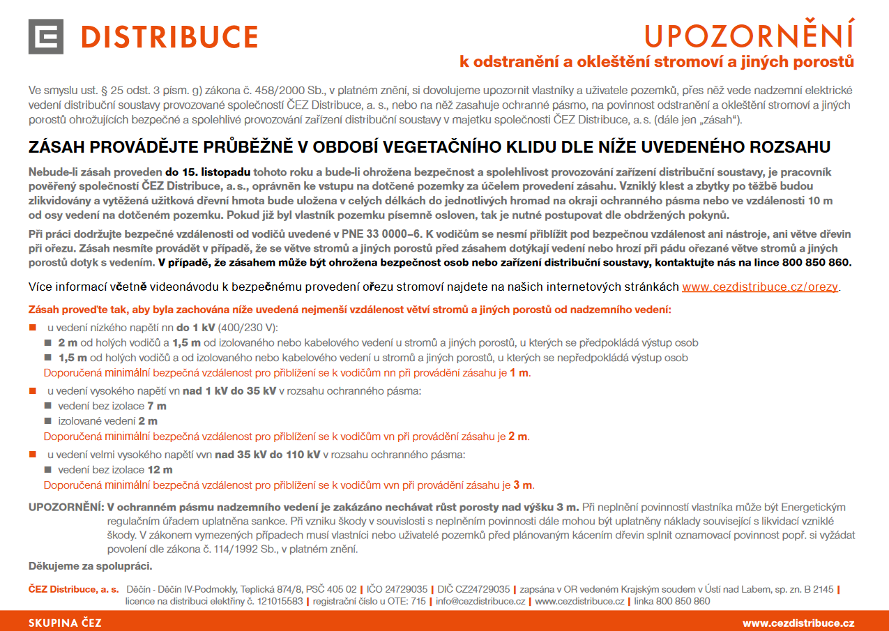ČEZ Distribuce, a. s., každoročně zasílá na města a obce žádost o zveřejnění upozornění k odstranění a okleštění stromoví způsobem v místě obvyklým. Dle příslušných ustanovení energetického zákona, má provozovatel distribuční soustavy právo odstraňovat a oklešťovat stromoví a jiné porosty, provádět likvidaci odstraněného a okleštěného stromoví a jiných porostů ohrožujících bezpečné a spolehlivé provozování zařízení distribuční soustavy v případech, kdy tak po předchozím upozornění a stanovení rozsahu neučinil sám vlastník či uživatel.