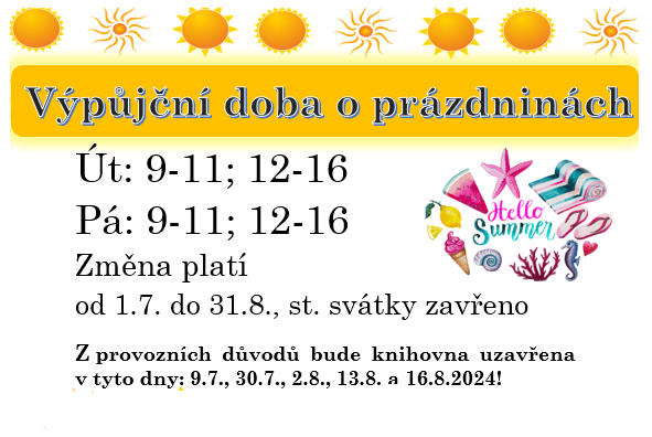 Z provozních důvodů bude knihovna uzavřena v tyto dny: 9.7., 30.7., 2.8., 13.8. a 16.8.2024!