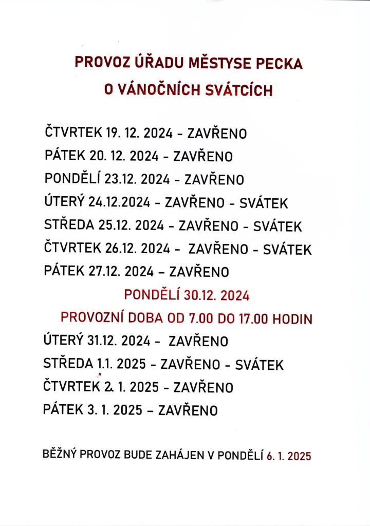 PONDĚLÍ 30. 12. 2024: PROVOZNÍ DOBA OD 7 DO 17 HOD.