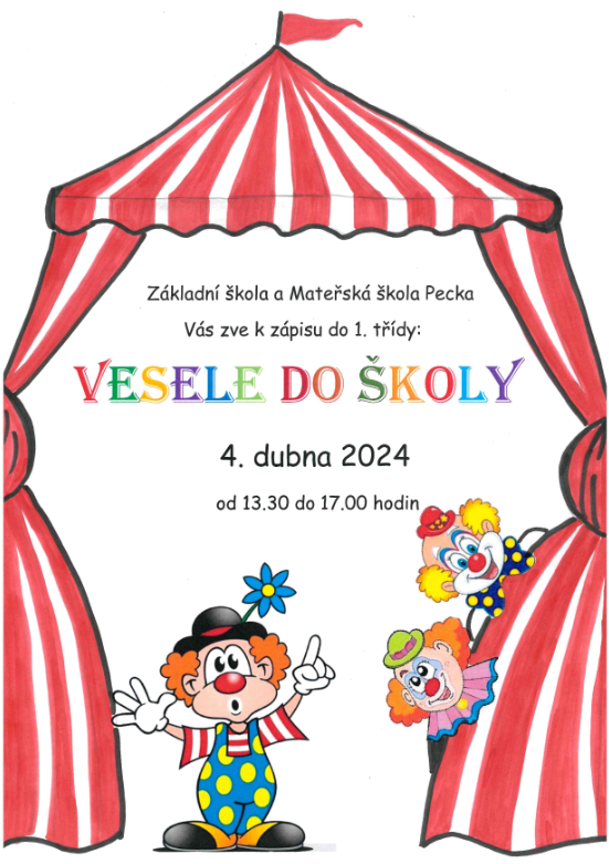 Základní škola a Mateřská škola Pecka Vás zve k zápisu do 1. třídy dne 4.dubna od 13.30 do 17 hodin. Těšíme se na Vás.