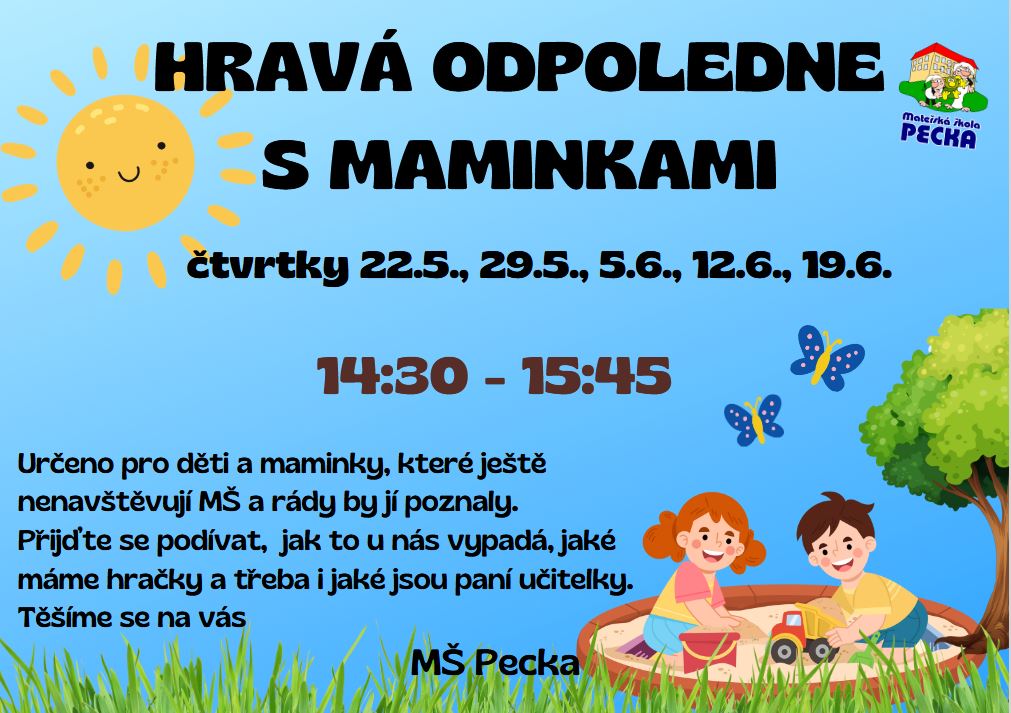 Zápis dětí do 1. třídy se koná v budově ZŠ dne 10. 4. 2025 od 13.30 do 17 hod. Zápis dětí do MŠ v Pecce se koná dne 5. 5. 2025 od 8.00 do 16.30 hod. Hravá odpoledne s maminkami se konají v MŠ ve dnech 22. 5., 29. 5., 5. 6., 12. 6. a 19. 6.