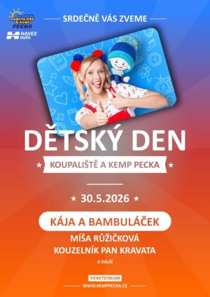 VI. ročník Dětského dne v areálu Koupaliště a kempu Pecka. Těšit se můžete na Káju a Bambuláčka, kouzelníka Kravatu a v neposlední řadě Míšu Růžičkovou.