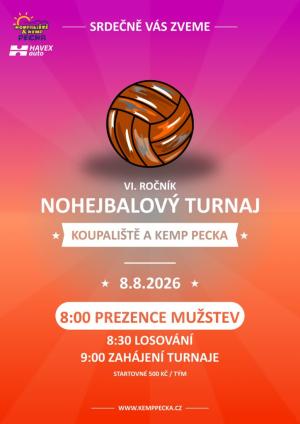 Zveme Vás na šestý ročník nohejbalového turnaje trojic v našem areálu Koupaliště a kempu Pecka! Registrované týmy se mohou těšit na spoustu věcných cen, pro diváky pak máme grilované maso, hamburgery a skvělé vychlazené pivo!
