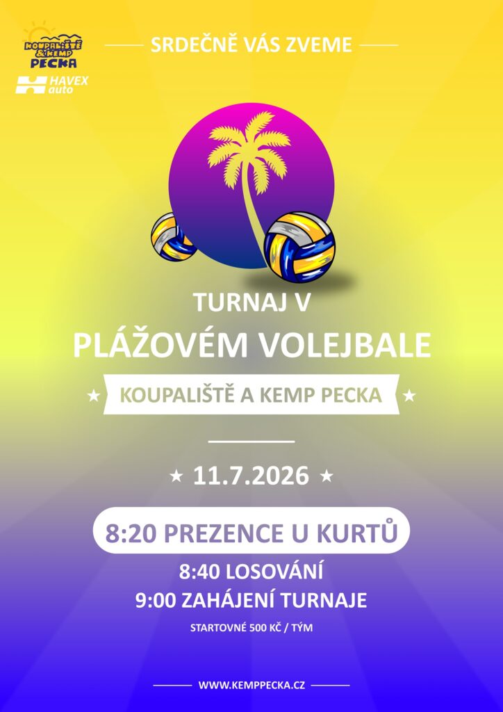 Zveme Vás na již tradiční turnaj v plážovém volejbale! Přihlášky týmů zasílejte prosím na email recepce@kemppecka.cz. Registrace do turnaje spouštíme od 1.6.2026!! Na dřívější přihlášky nebude brán zřetel!!